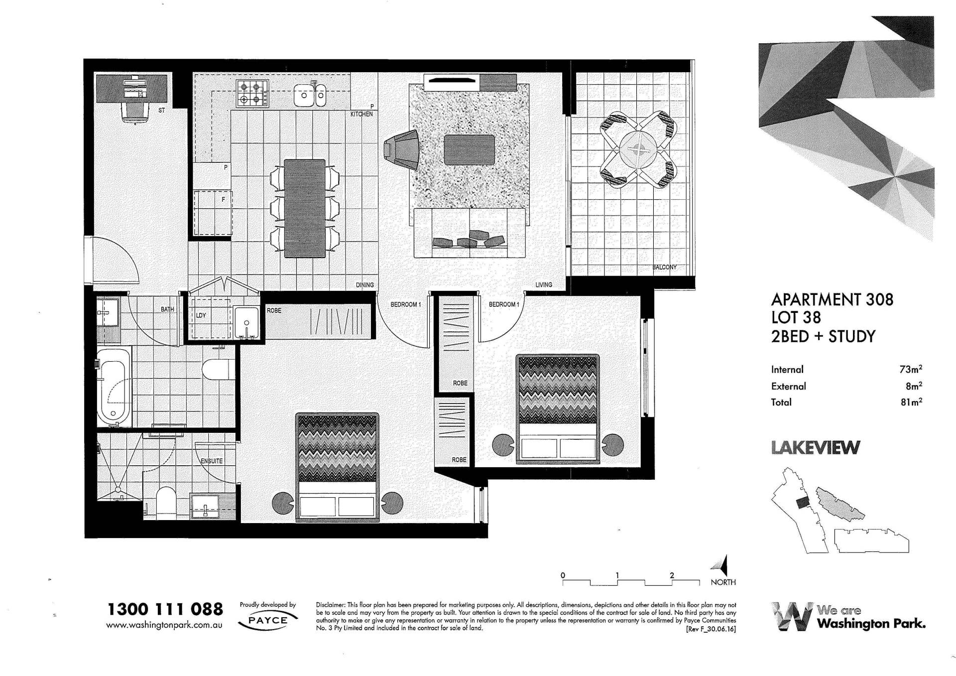 Fresh & Bright 2 bedrooms + Study with Lake Views