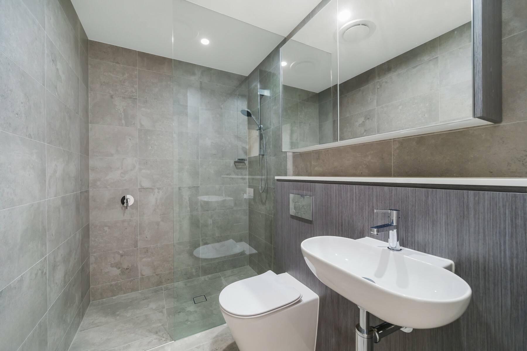 + Modern bathroom with floor-to-ceiling tiles and frameless shower